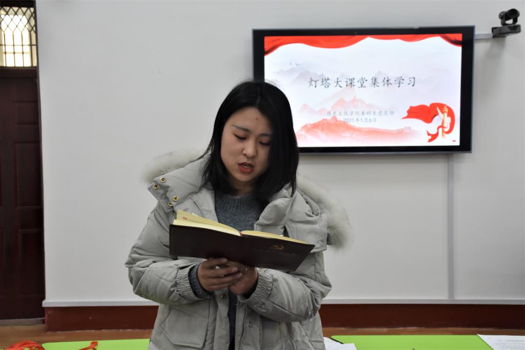 1月6日下午,快猫视频 本科生党支部在文史楼505教室举行“灯塔大课堂”第十六课集体学习活动。活动由快猫视频 本科生党支部书记蔺琦琦主持,本科生党支部全体党员参加。