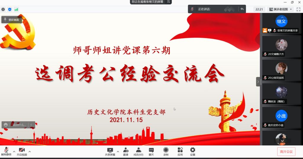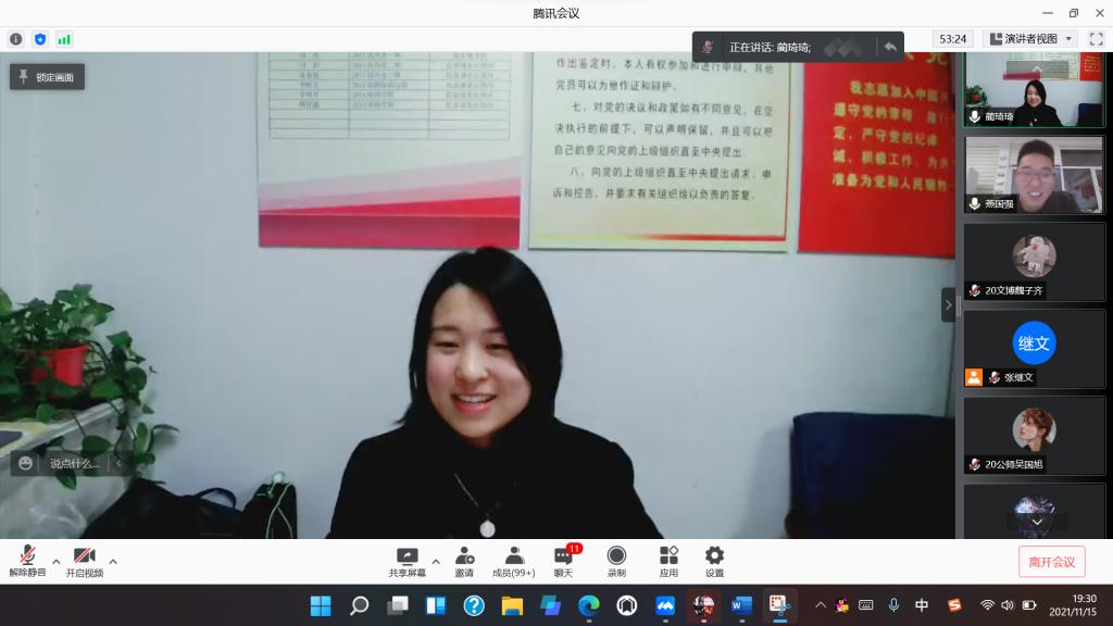 11月15日晚,快猫视频 本科生党支部通过腾讯会议线上举办2021年第六期师哥师姐讲党课活动。会议由2017级燕国强同志担任主讲人,本科生党支部书记蔺琦琦同志主持。