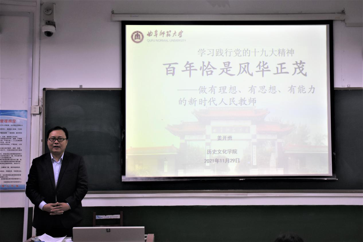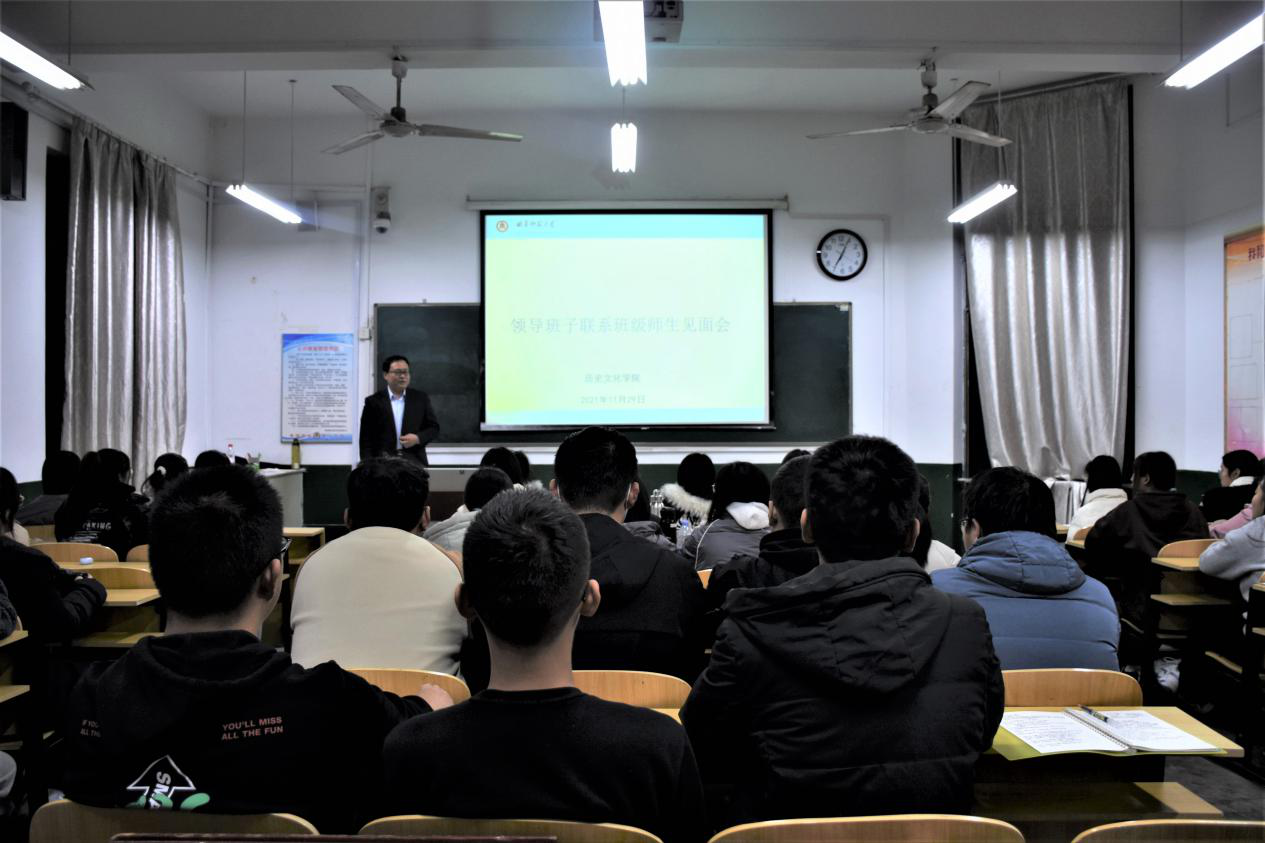 11月29日晚,快猫视频 党委书记姜开勇于文史楼309教室给联系班级讲思政课,并顺利召开了领导班子联系师生见面会,2021级公费师范生班全体成员参加会议。