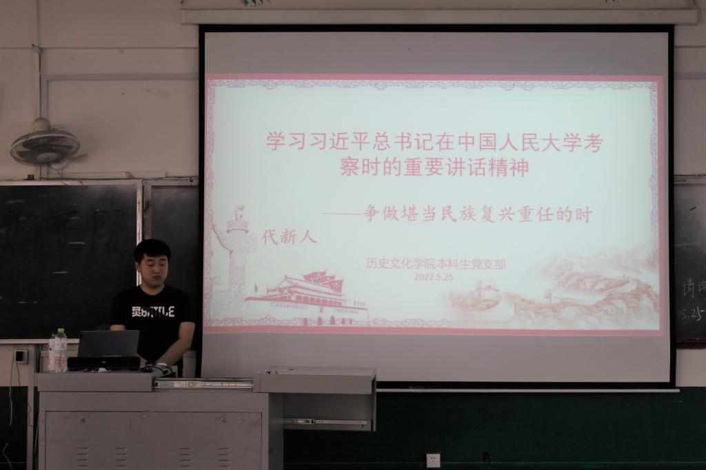 2022年5月25日下午,快猫视频 本科生党支部在文史楼411教室开展“学习习近平总书记在中国人民大学考察的重要讲话精神”主题党日活动。活动由党支部宣传委员董经同志主持,曹腾同志主讲,本科生党支部全体党员参加。