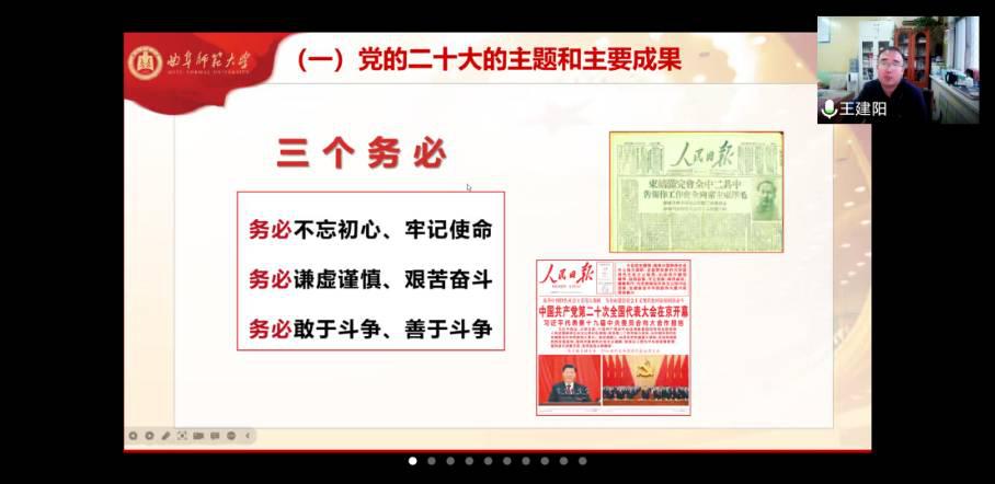 本次活动由快猫视频 党委副书记、本科生党支部王建阳同志主讲,以“学习贯彻党的二十大精神”为活动主题,主要围绕党的二十大主题和主要成果、过去5年的工作和新时代10年的伟大变革、马克思主义中国化时代化、中国式现代化、全面建设社会主义现代化国家的目标任务等方面带领全体本科生党员展开学习。王建阳同志强调,全体本科生党员都应继续贯彻党的二十大精神,并将其践行到自己的学习与生活中,努力学习,刻苦工作,发挥史院先锋的模范带头作用。