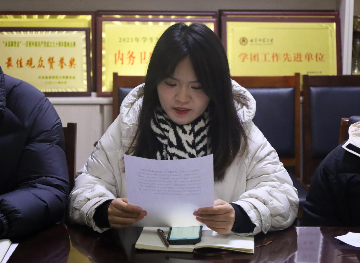 会议开始由本科生党支部副书记董经同志介绍了周津羽、李雨繁等22名同志的基本情况,报告与会人数,介绍会议流程,并宣布纳新大会开始。