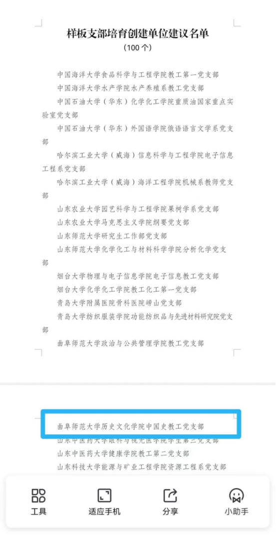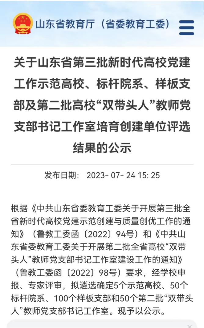 近日,山东省教育厅公布关于山东省第三批新时代高校党建工作示范高校、标杆院系、样板支部及第二批高校“双带头人”教师党支部书记工作室培育创建单位评选结果,共确定5个示范高校、50个标杆院系、100个样板支部和50个第二批“双带头人”教师党支部书记工作室。快猫视频 中国史教工党支部获评山东省第三批新时代高校党建工作样板支部。