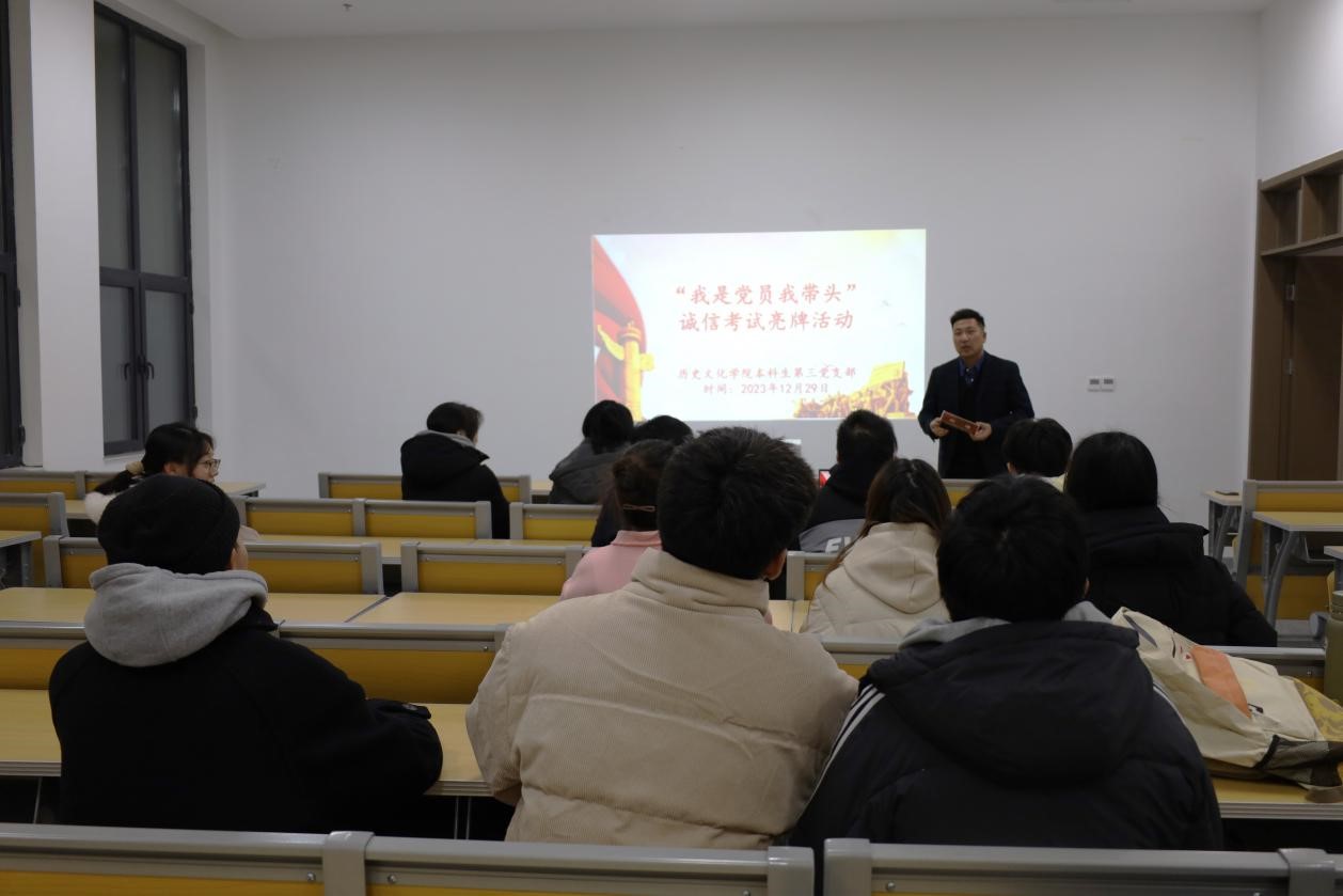 为引导广大学生培养正确的考试观念,维护考试纪律。2023年12月29日,快猫视频 本科生第三党支部于孔子书院B106召开十二月份主题党日活动暨“我是党员我带头”诚信考试亮牌活动。活动由本科生第三党支部书记董经同志主持,本科生第三党支部全体成员参加。