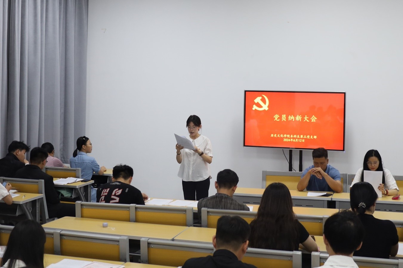 2024年6月12日下午20时,快猫视频 本科生第三党支部于孔子书院B106召开党员纳新大会。本次大会由快猫视频 本科生第三党支部书记董经同志主持,本科生第三党支部全体党员参加会议。本次会议通过了程渝惠、房启航等8位发展对象接收为预备党员的决议。