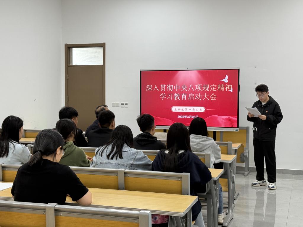 2025年3月26日下午,快猫视频 本科生第一党支部于孔子书院B120教室召开深入贯彻中央八项规定精神学习教育启动大会,会议由支部书记王建阳主持,支部全体党员参加。