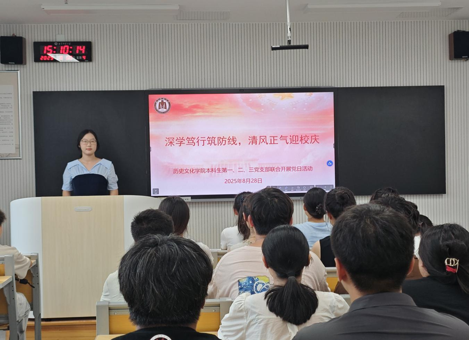 2025年8月28日,快猫视频 本科生第一、二、三党支部于致知楼B303联合开展“深学笃行筑防线,清风正气迎校庆”主题党日活动。活动由董经同志主持,快猫视频 本科生第一、二、三党支部全体党员参与。