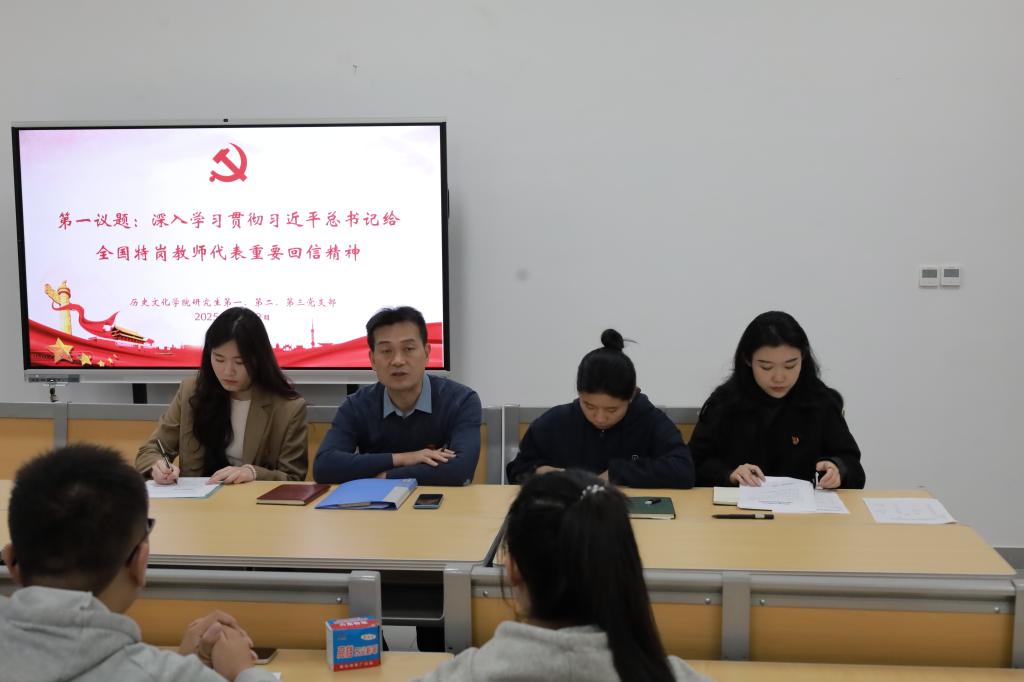 会上,研究生第二党支部魏明宇、第三党支部李美琪结合自己的学习工作,分别就学习贯彻党的二十届四中全会精神和习近平总书记给全国特岗教师代表重要回信精神谈了自己的体会。孙锋对本次活动进行了总结,希望全体党员同志持续深入学习贯彻党的二十届四中全会精神和习近平总书记给全国特岗教师代表重要回信精神,在推进强国建设、民族复兴伟业中展现青春作为、彰显青春风采、贡献青年力量。