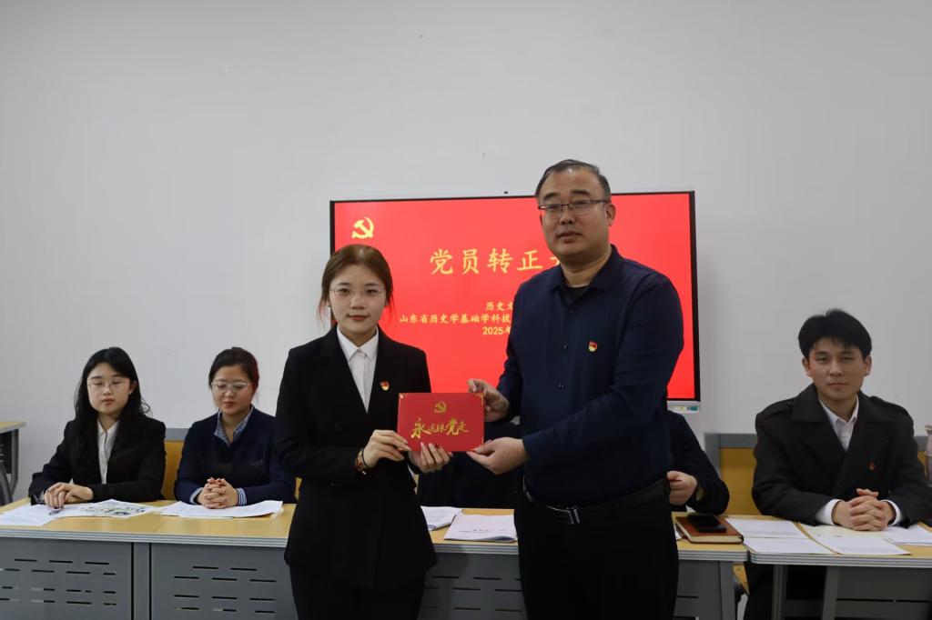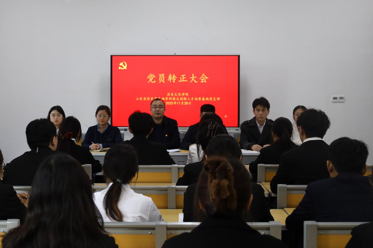 11月28日下午,快猫视频山东省历史学基础学科拔尖创新人才培养基地党支部于孔子书院B106室召开转正大会,大会由党支部书记王建阳主持。