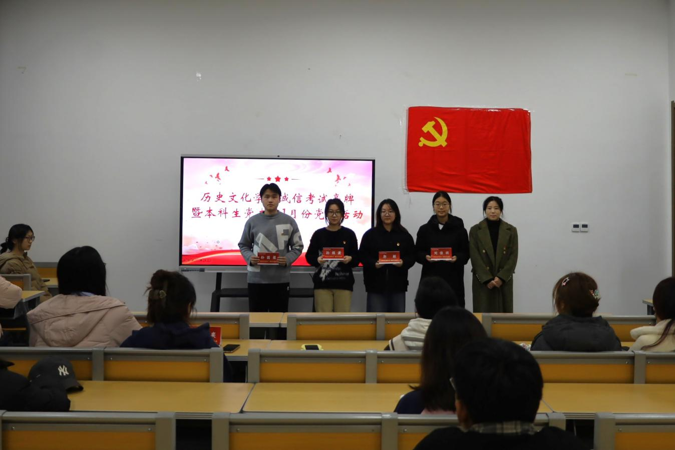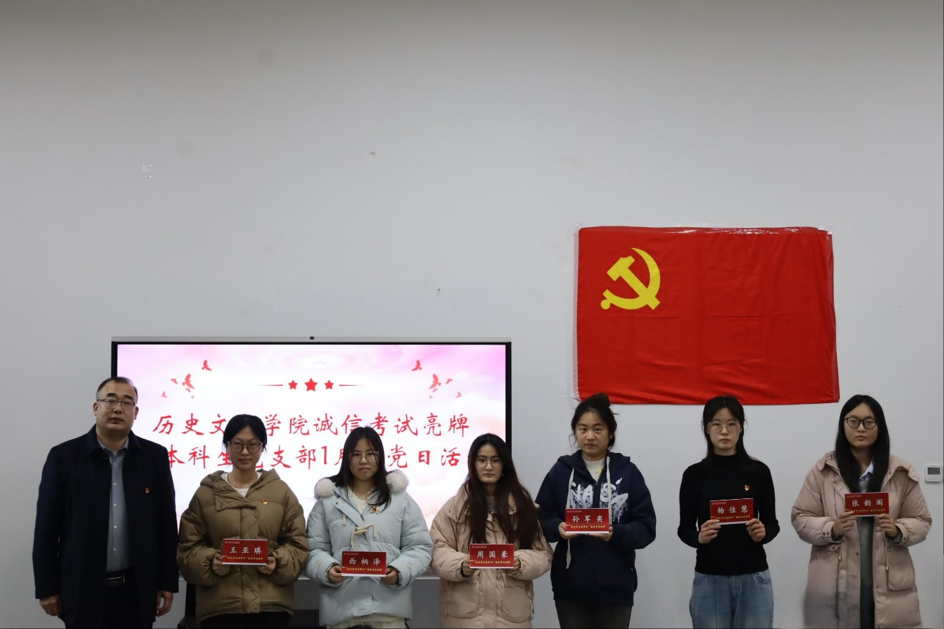 2026年1月2日,快猫视频 本科生党支部于孔子书院B106开展“我是党员我带头”诚信考试亮牌活动暨一月份主题党日活动,此次活动由第三党支部书记董经同志主持,学院党委副书记王建阳同志、本科生第二党支部书记刘贤贤同志、2025级辅导员韩瑞娟同志列席,2023级全体党员同志参与。