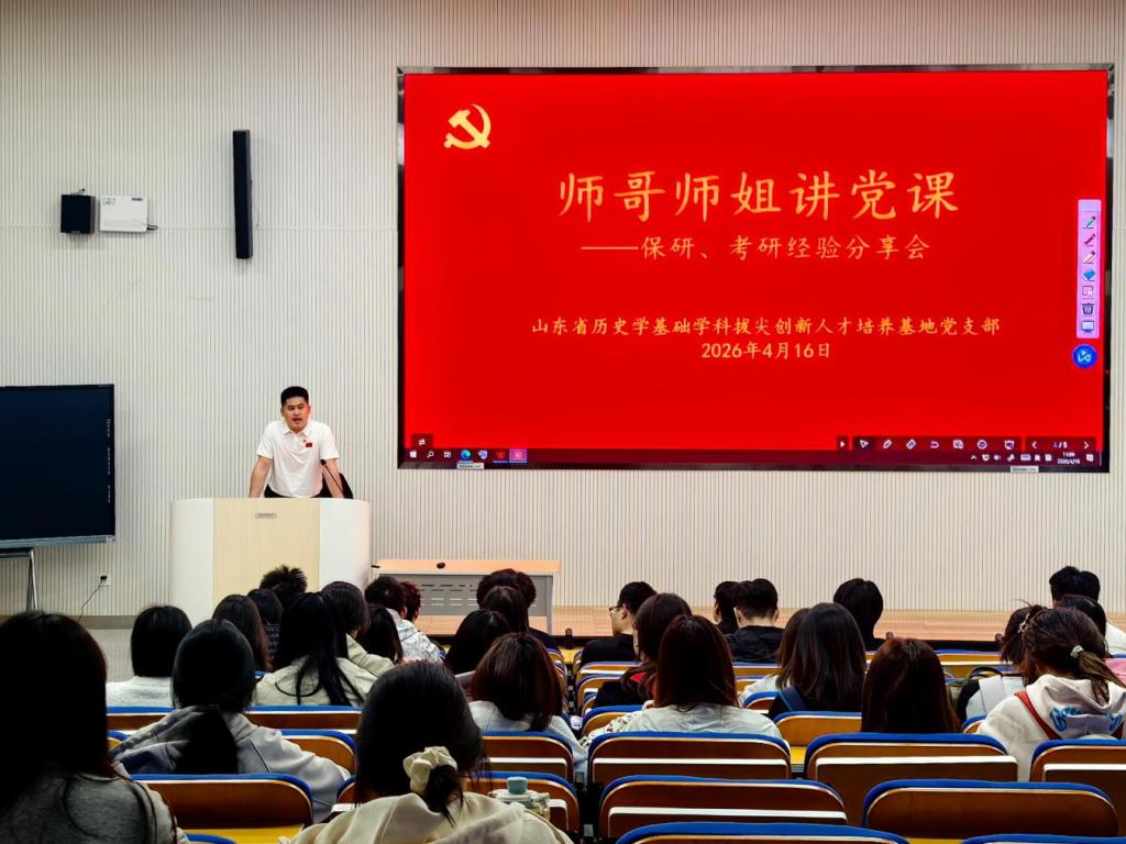4月16日上午,快猫视频 山东省历史学基础学科拔尖创新人才培养基地党支部组织开展“师哥师姐讲党课”系列活动,党员高凯月、李琪在2024级国学班、文化产业管理班、文物与博物馆学班开展保研、考研经验分享和考研升学启蒙教育活动。