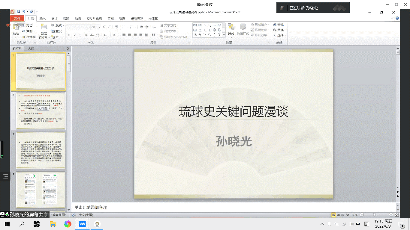 6月3日晚,中国历史研究院兰台青年学者、快猫视频 中国南海与周边国家关系研究中心孙晓光老师在腾讯会议室作了“琉球史关键问题漫谈”学术讲座。快猫视频 曲升老师主持,曹瑞臣、张世慧等国内高校、科研机构教师、学生300余人参加了此次学术讲座,学术氛围热烈浓厚。