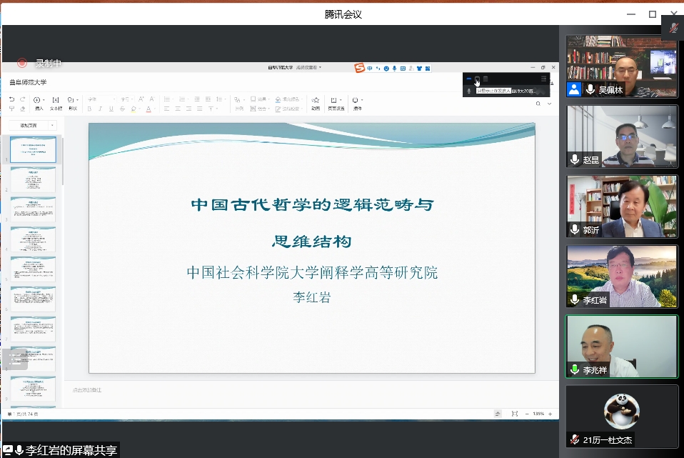 6月13日晚,快猫视频 洙泗讲堂成功举办了题为“中国古代哲学的逻辑范畴与思维结构”的学术讲座。本次讲座由中国社会科学院大学教授、中国社会科学杂志社研究员、博士生导师李红岩教授主讲,快猫视频 副校长李兆祥教授主持,孔子文化研究院郭沂教授与《齐鲁学刊》主编赵昆教授担任评议人。会议采取线上、线下两种方式同时进行,相关专业师生及线上听众共300余人参加了此次活动,会议内容十分精彩。
