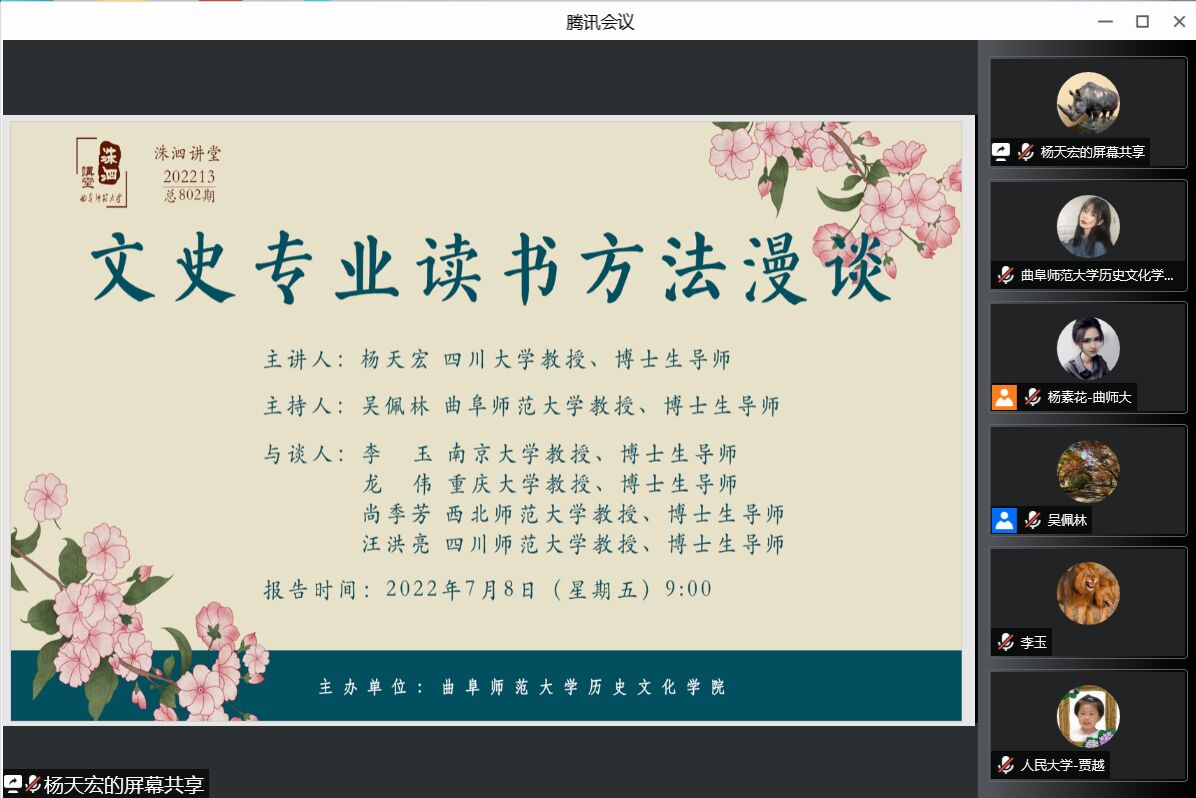 为让学生度过一个有意义的暑假,2022年7月8日上午9点早,快猫视频 以讲座的形式开启了暑期读书计划。本期讲座主题为“读书六法:朱熹读书方法演绎”。 主讲人为四川大学教授、博士生导师杨天宏教授。讲座由快猫视频 吴佩林教授主持,南京大学李玉教授、四川师范大学汪洪亮教授、重庆大学龙伟教授、西北师范大学尚季芳教授、中国人民大学刘贤副教授担任与谈人。讲座采取腾讯会议直播的方式进行,相关专业师生及线上听众共300余人参加了此次活动,讲座内容十分精彩。
