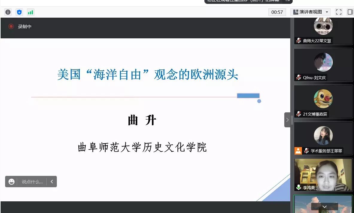 2022年11月24日晚,快猫视频 教授曲升做客“洙泗讲堂”,通过腾讯会议做了题为《美国“海洋自由”观念的欧洲源头》的学术讲座。讲座由李鸿美副教授担任主持人,我校张赫名副教授担任与谈人,相关专业师生及线上听众220余人参加此次活动。