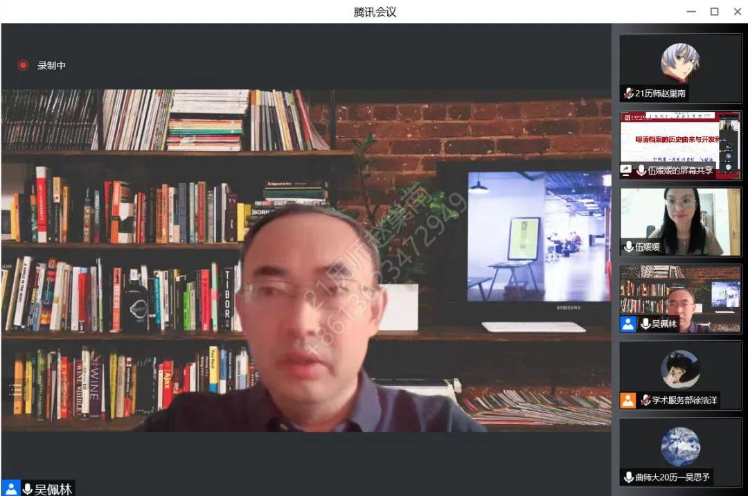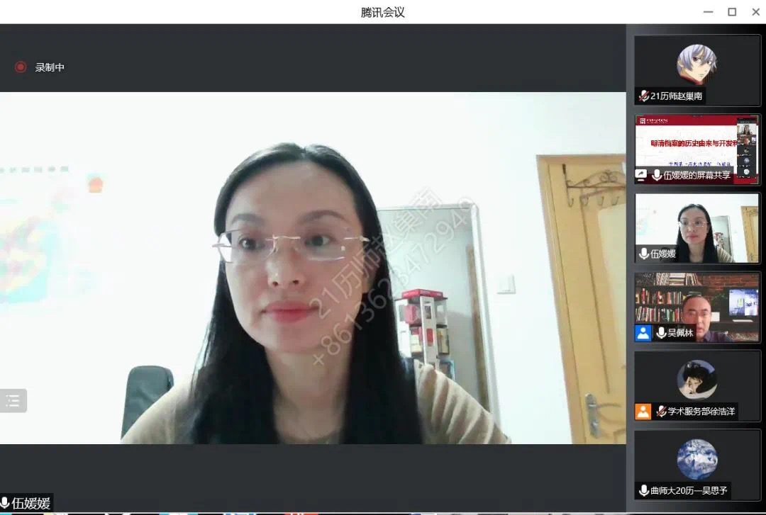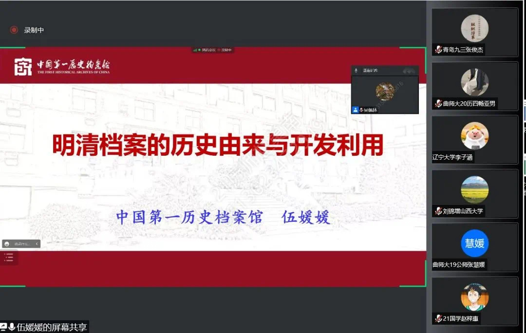 8月14日晚,中国第一历史档案馆利用处副处长、历史文献学博士、副研究馆员,中国档案学会档案文献编纂学术委员会委员伍媛媛作客“洙泗讲堂”,通过腾讯会议为我校师生作了题为《明清档案的历史由来与开发利用》的学术讲座。讲座由快猫视频 院长吴佩林教授主持,相关专业师生及线上来自全国各地的听众共400余人参加了此次活动,讲座内容十分精彩。