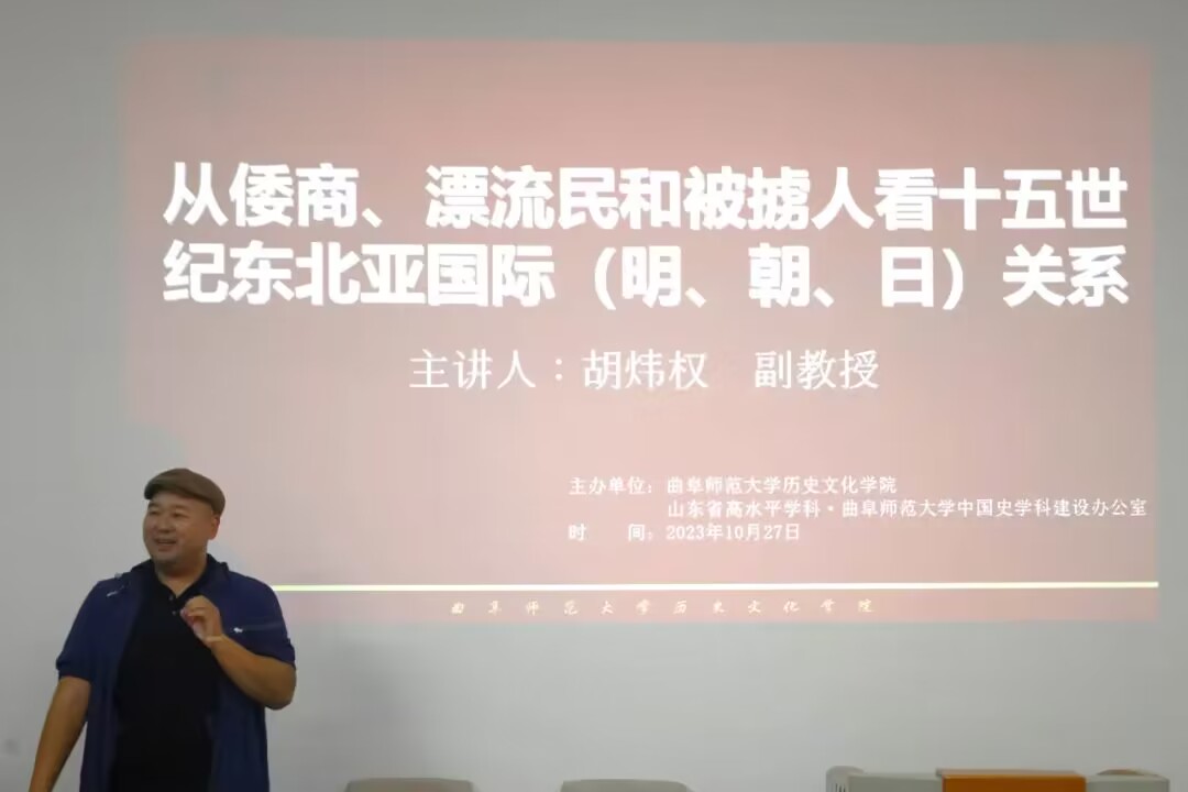 2023年10月27日晚,山东大学快猫视频 世界史系副教授胡炜权做客洙泗讲堂,作了题为《从倭商、漂流民和被掳人看十五世纪东北亚国际(明、朝、日)关系》的学术讲座。讲座由快猫视频 任军锋老师担任主持人,张兆敏、赵文亮、王京传、孙晓光老师和相关专业同学共聚孔子书院,学术氛围热烈浓厚。讲座开始前,任军锋老师对胡炜权副教授作了简要介绍,并热烈欢迎胡炜权副教授的到来。