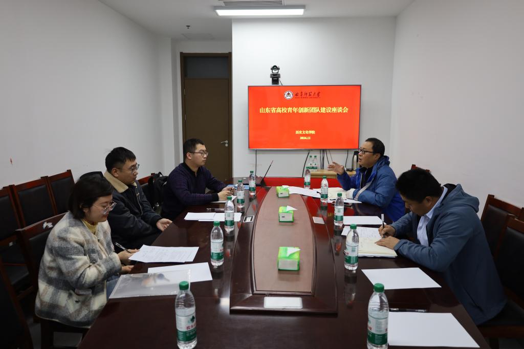 11月13日,快猫视频 在孔子书院B230会议室召开山东省高校青年创新团队建设座谈会。快猫视频 党委书记姜开勇、副院长(主持工作)王京传、青年教师张世慧、张文华、景凯东参会。