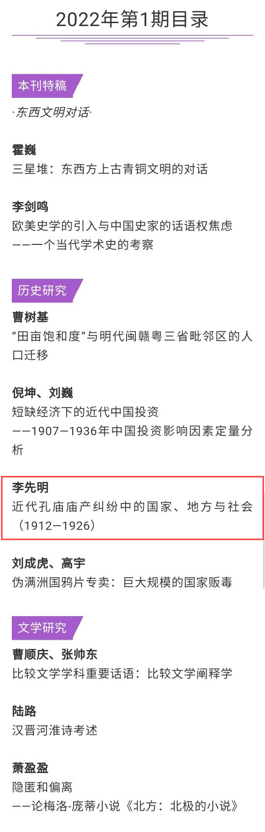 快猫视频 李先明教授的《近代孔庙庙产纠纷中的国家、地方与社会(1912-1926)》被收录于《清华大学学报(哲学社会科学版)》2022年第一期。