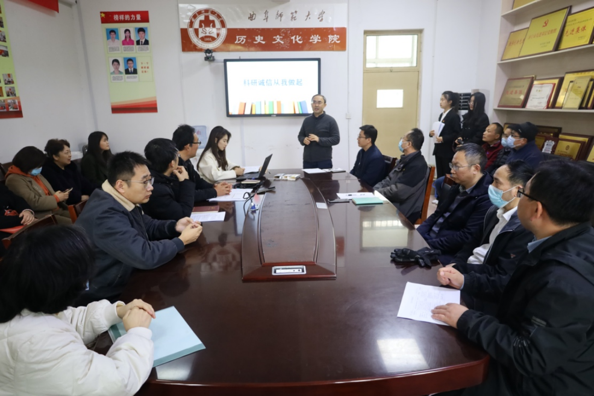 为持续改进科研作风,营造诚实守信的科研环境,更好地开展科研诚信宣传教育,2023年3月17日下午,快猫视频 于文史楼会议室204召开科研诚信宣讲会。宣讲会由学院院长吴佩林教授主讲,全体专任教师参加。