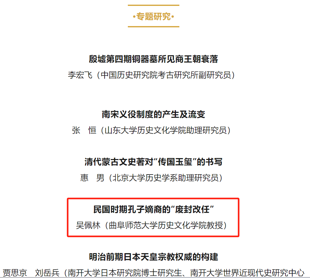 自清朝被推翻,建立民国开始,世袭贵族在中国基本消失,直到南京民国政府后,改封“衍圣公”孔德成为大成至圣先师奉祀官停止。吴佩林教授的论文以孔子嫡裔的“废封改任”为研究对象,认为民国政府利用孔子嫡裔的名号由爵位向职官演变,其政治意图甚于阐扬儒家文化本身。民国建立后,北洋政府保留孔子嫡裔“衍圣公”世爵,试图借助儒家符号提升自身统治合法性。南京国民政府初期,衍圣公名号因其封建属性引发新旧势力对垒与颉颃,其后在国民党实权派的干预下得以暂存。九一八事变后,南京国民政府最终以改衍圣公名号为“大成至圣先师奉祀官”的方式,将孔子嫡裔纳入现行政治体制。孔子嫡裔名号由爵位向职官的演变,既是民族危机与时局因素共同作用的结果,也是南京国民政府采用调和手段收拾人心的政治行为,其利用圣裔象征的政治意图甚于阐扬儒家文化本身。