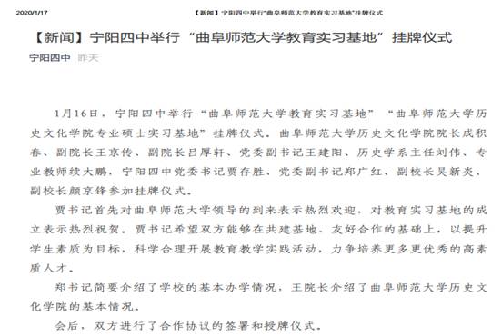 1月16日上午,快猫视频 在宁阳县第四中学举办教育实习基地揭牌仪式。宁阳县第四中学党委书记贾存胜、副书记郑广红、副校长吴新炎和颜景锋,快猫视频 院长成积春、副院长王京传、党委副书记王建阳、副院长吕厚轩、历史学系主任刘伟、工会委员续大鹏参加揭牌仪式。