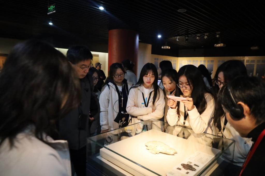 上午9时,全体师生抵达博物馆。在讲解员引导下,依次参观了甲骨文、金文、小篆等专题展区。通过实物展品、高清影像及互动技术,让学生直观了解了汉字从商周甲骨文到秦汉小篆的演变脉络,以及不同历史时期文字的形态特征与文化功能。甲骨文展区通过复原商代占卜场景,生动呈现了文字与早期社会生活的紧密关联。参观期间,学院带队教师及讲解员老师与同学们进行实时交流,结合展品详细讲解文字学研究方法。博物馆展示的数字化保护成果,如三维扫描与虚拟复原技术,也引发了同学们对科技与人文融合的思考。