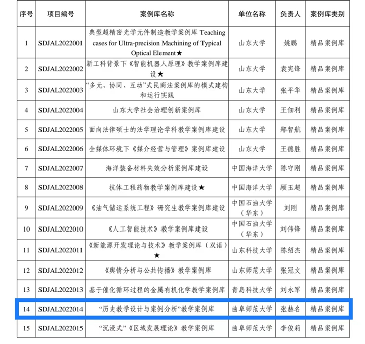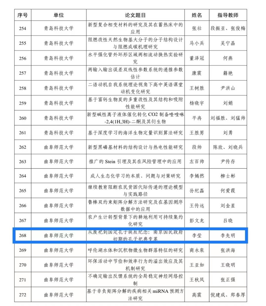 近日,山东省教育厅下发《关于公布2022年研究生导师指导能力提升项目评选结果的通知》《关于公布2022年山东省研究生优质教育教学资源项目立项建设名单的通知》。快猫视频 张赫名副教授申报的“历史教学设计与案例分析”教学案例库荣获2022年山东省优质专业学位教学案例库;2018级中国史专业研究生李莹同学的硕士学位论文《从废祀到国定孔子诞辰纪念:南京国民政府初期的孔子祀典变革》(指导教师李先明教授)、姚志良同学的硕士学位论文《民国时期曲阜孔庙祀田清理问题研究(1928-1937)》(指导教师吴佩林教授)获2022年山东省优秀硕士学位论文;2020级世界史专业研究生娄婷婷同学申报的科研成果“明代琉球中介贸易对东亚经贸活动的影响”(指导教师孙晓光教授)、2021级学科教学(历史)专业研究生丁雅琼同学申报的科研成果“冷战教学设计”(指导教师吕厚轩副教授、郭庆海讲师)获2022年山东省研究生创新成果。