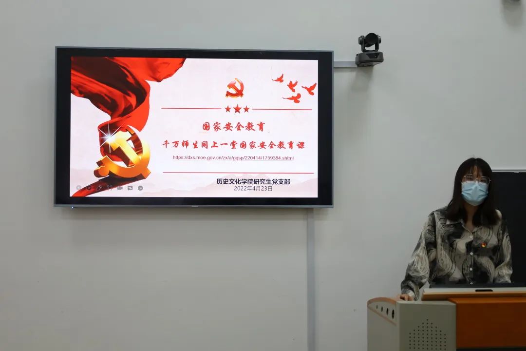 4月23日,快猫视频 研究生党员和学生干部在文史楼五楼会议室集中观看了“千万师生同上一堂国家安全教育课”主题公开课,由山东大学薛冰老师、北京大学赵冠英老师、腾讯守护者计划张文涛老师、北京师范大学学生刘懿莹联合分享,共话国家安全,共同感悟新时代国家安全成就。