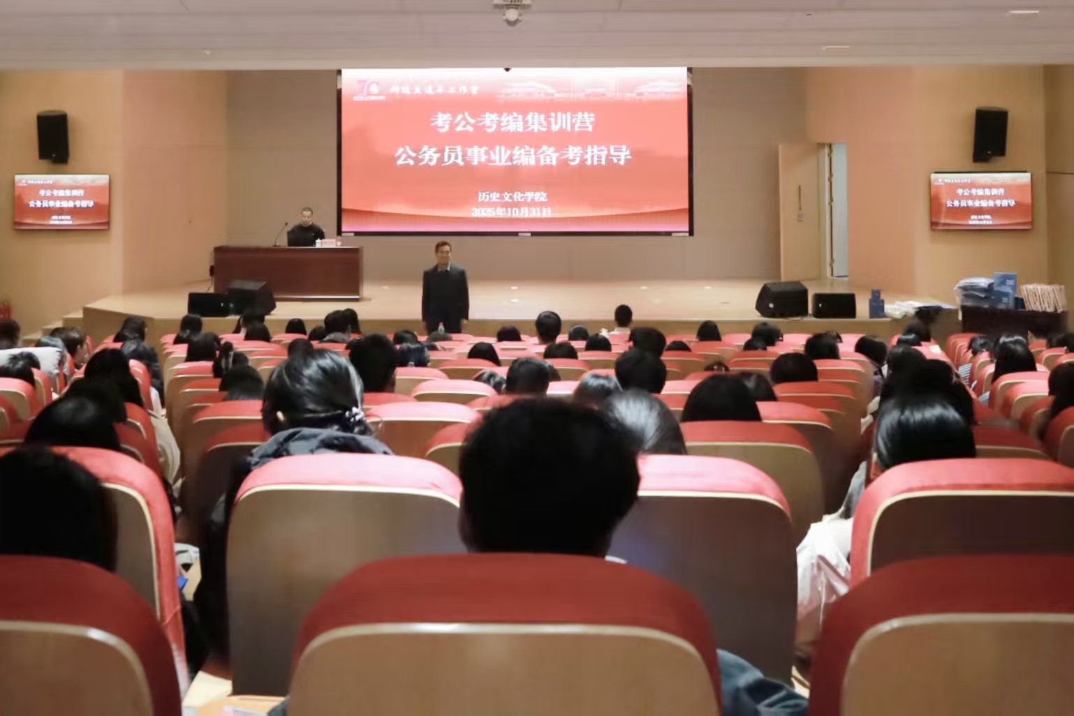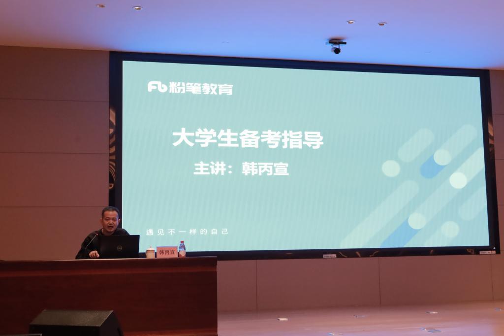 为帮助广大学生系统了解公职类考试政策,掌握科学备考方法,提升应试能力,拓宽高质量就业途径,10月31日下午,快猫视频 联合知名教培机构粉笔教育在西校区图书馆东辅楼报告厅举办公务员事业编备考专题讲座。本次讲座由快猫视频 “研途职通车”工作室“考公考编集训营”策划,快猫视频 研究生辅导员、“研途职通车”工作室主持人孙锋出席并主持活动,北京粉笔天下科技教育有限公司济宁分公司职业指导讲师韩丙宣担任主讲嘉宾。快猫视频 本科生、研究生及部分外院学生200余人参加本次活动。