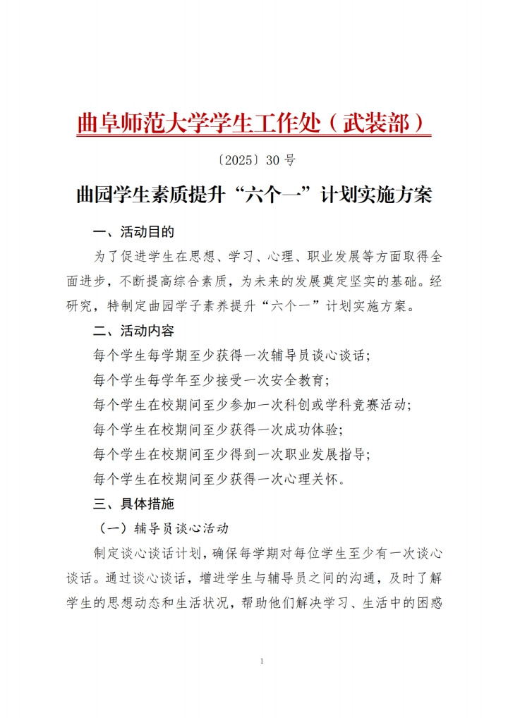 曲园学生素质提升“六个一”计划实施方案