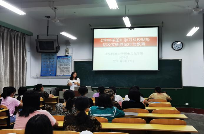 9月17日晚,快猫视频 于文史楼各班教室举办新生入学教育之《学生手册》学习及校规校纪及文明养成行为教育活动。活动由快猫视频 2021级新生辅导员石璐、刘贤贤主持。