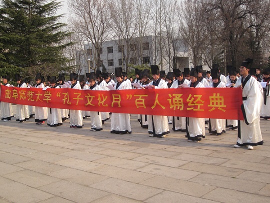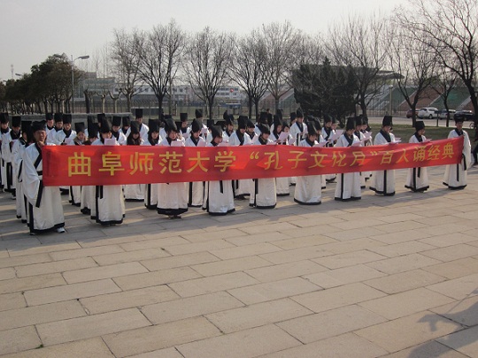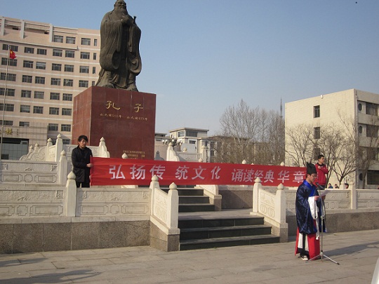 3月25日下午,第四届“孔子文化月”系列活动之“百人诵经典”活动在孔子文化广场隆重举行。本次活动以“弘扬传统文化,诵读经典华章”为主题,活动现场数百名孔子文化使者穿戴儒服,肃立在孔子像前,齐声诵读了《大学》、《论语》中的经典篇章,吸引了众多行人驻足。