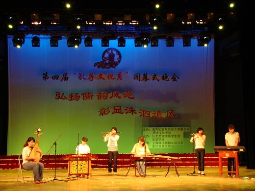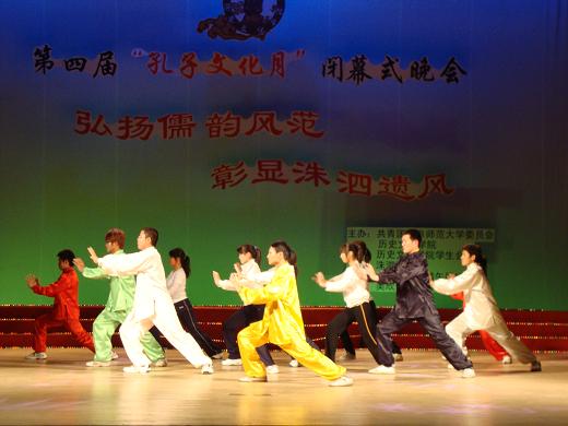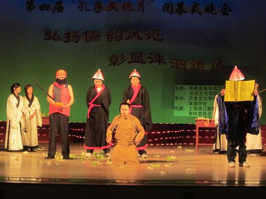 晚会首先回顾了一个多月以来,本届“孔子文化月”举办的一系列活动:国内知名儒学专家的满载学术气息的讲座,缅怀圣贤、追寻儒宗的祭祀大典,富有传统文化色彩的国学知识竞赛、大学生成人礼、历史话剧大赛等都为曲院增添了独特的风采。随后,演员们为现场观众表演了天人合一、外柔内刚的太极拳,民族器乐合奏,儒家经典诵读等一系列传统文化节目,同时,本届历史话剧中涌现出的优秀作品也在现场进行了表演,现场观众反应热烈,掌声连连。晚会现场同时公布了优秀孔子文化使者以及本届“孔子文化月”系列活动的获奖名单。