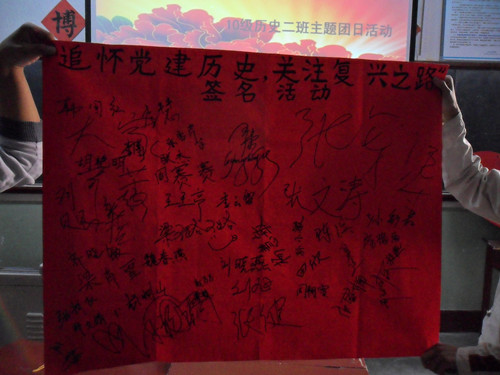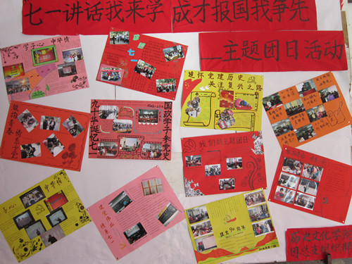 本次主题团日活动得到了各团支部的积极响应。各团支部组织了党史知识竞赛,进行了以“庆祝建党九十周年”为主题的板报设计活动;各团支部围绕团日活动主题,绘制了精美的手抄报,并于文史楼前进行了集体展览。这些活动使团员们更为深刻地领悟了党的精神,提升自己的思想境界和觉悟,也提高了团员们运用科学理论认识问题、分析问题的能力。同时,各团支部根据团日主题自行举办了形式多样的特色团日活动,通过红歌比赛、篮球赛、党史话剧表演、党史电影欣赏等寓教于乐的活动方式激发了团员们奋发向上的斗志,增进了团员间的团结协作精神,增强了团支部的凝聚力和向心力,也确立了团员们跟党走中国特色社会主义道路的信心和决心。