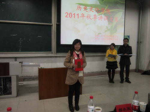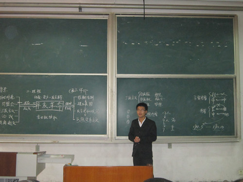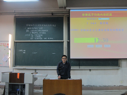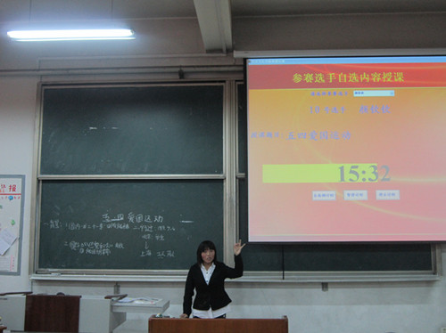 本次讲课大赛决赛共11位选手参加,观众积极参与,座无虚席。选手们均采用板书形式进行授课,所选讲课内容主要围绕中学历史课本进行讲解,包括《辛亥革命》、《梨园春秋》、《北魏孝文帝》等。选手们所写板书规范,语言清晰流畅,并结合所讲内容深入浅出的分析问题,与现场观众进行互动,教学形式灵活。此次大赛使用电脑计算选手所用时间及公布分数,更加人性化及公开化。赛后,王昌沛老师对整场辩论赛进行了点评,肯定了选手们的精彩表现后指出了不足之处,为同学们提出了宝贵意见。