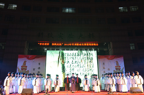 9月21日晚,“青春迷彩 扬帆起航”我校2013年军训歌咏比赛暨迎新晚会在科技楼前拉开序幕。