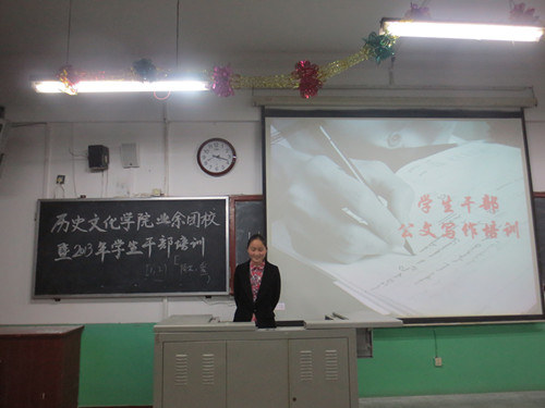 11月19日,快猫视频 2013年业余团校暨学生干部培训班在文史楼411举行。团总支副书记姜汶青、学生会主席张宇轩、副主席杨昆、秘书长刘佳奇、学生会外联部部长侯俊玲、网络部部长宋立强等出席了培训班。
