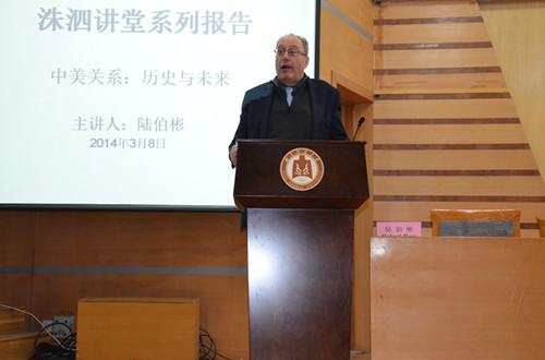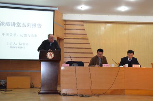 陆伯彬以不同历史阶段内中美关系的发展状况为主线,用其独特的乐观现实主义视角分析了中美两国关系的进程。肯定了在此过程中中国的崛起及其在国际社会中日益重要的地位,同时通过阐述中美对朝鲜、日本、菲律宾等国家的对外政策和外交态度,分析了中美之间的冲突与合作,也指出了中美关系中存在的问题并对中美关系的未来作出了乐观的展望,并对在场同学提出的问题做了详细解答。成积春对此次报告进行了总结,并对陆伯彬教授的到来表示了感谢。