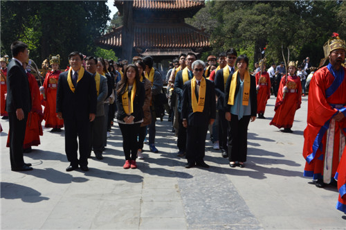 上午,台湾高校与快猫视频 的师生代表共同来到孔庙大成殿朝圣谒孔,省台办、港澳台合作处以及快猫视频 等单位负责人出席仪式。祭孔大典开始,参祭的两岸师生代表先后敬献花篮。快猫视频 院长成积春教授诵读了祭文,表达了对圣贤的尊重敬仰,对两岸青年以传统文化、圣哲思想为基础实现深度交流的愿望,以及对两岸共同繁荣发展、共筑和谐社会的美好希冀。在我校学生代表孙芳的领读下,两岸青年学生齐诵《论语》经典篇章全体参祭人员整冠肃立,向至圣先师行三鞠躬礼,祭孔大典在庄严肃穆的氛围中结束。
