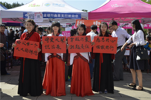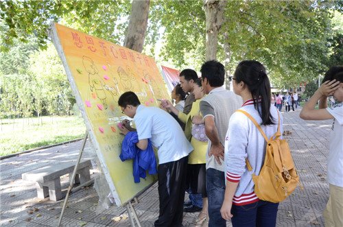 9月12日上午,2015级新生陆续前来报到, 快猫视频 在迎新工作中积极推行“接过爸妈手中的行李”、“我的行李我来提”、“给父母一个拥抱”等一系列感恩教育活动。通过制作宣传板、征集感恩话语等多种方式来对感恩教育进行宣传,时刻提醒新生学会感恩、独立承担责任。