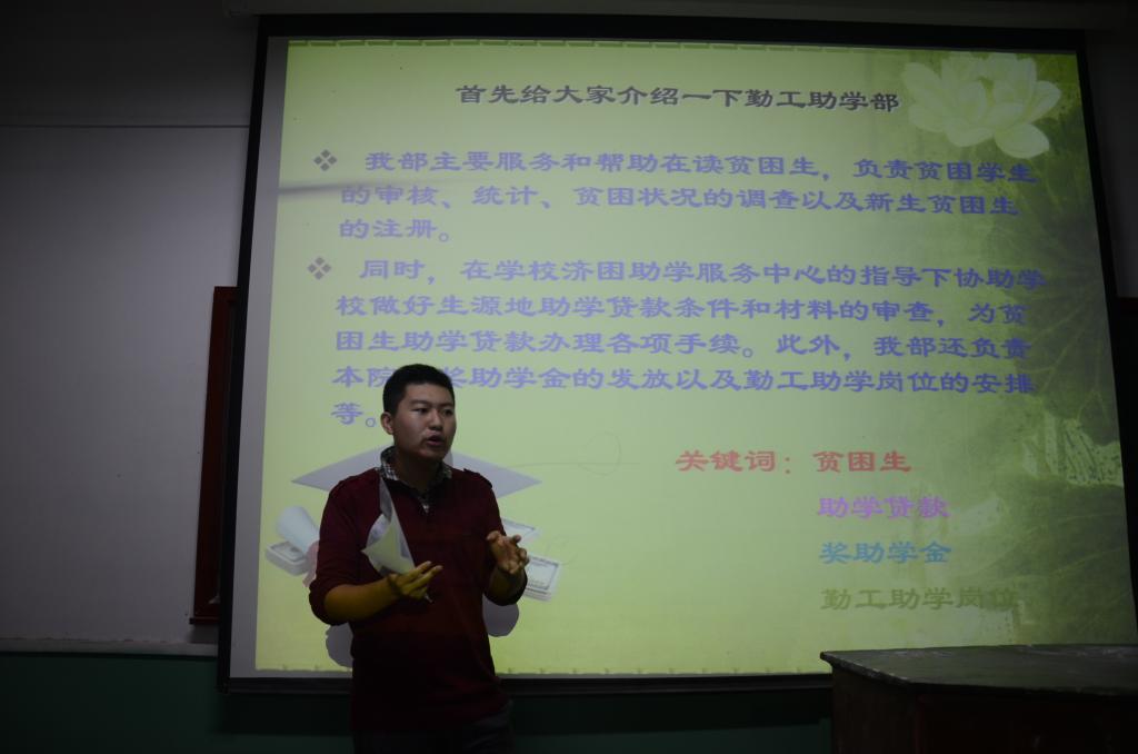 9月14日晚,由快猫视频 学生会学习部、劳卫部和勤工助学部承办的新生入学教育系列活动之学习、卫生、勤工助学知识讲座在2015级各班教室举行。