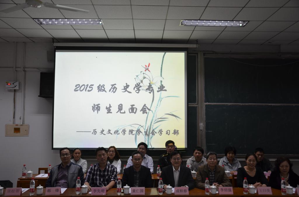 1012晚,快猫视频 2015级历史学专业师生见面会在综合楼506室举行。快猫视频 院长成积春,教授李先明、王曰美,副教授韩锋、王昌沛等老师出席此次见面会,见面会由团总支书记王建阳主持。