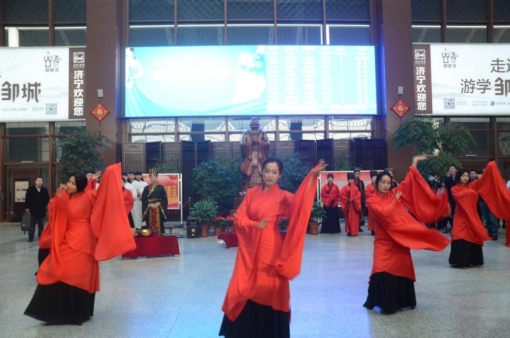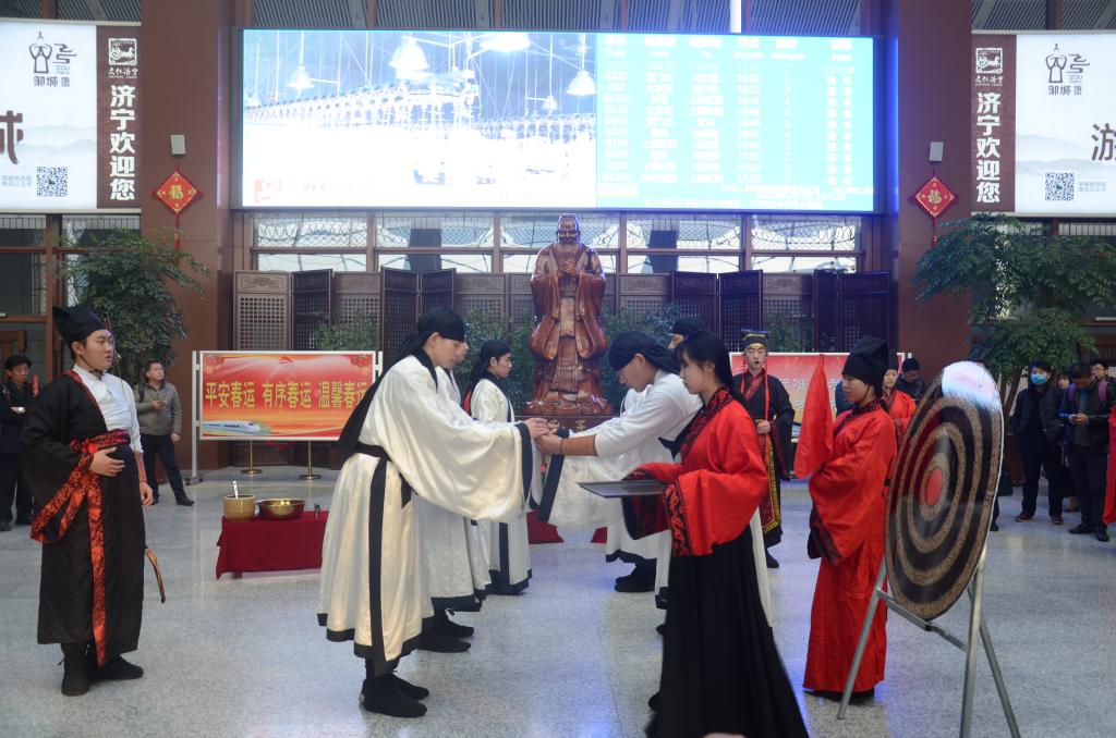 1月12日下午,快猫视频 传统礼仪展演队的学生在曲阜东站进行了古色古香的射礼表演。