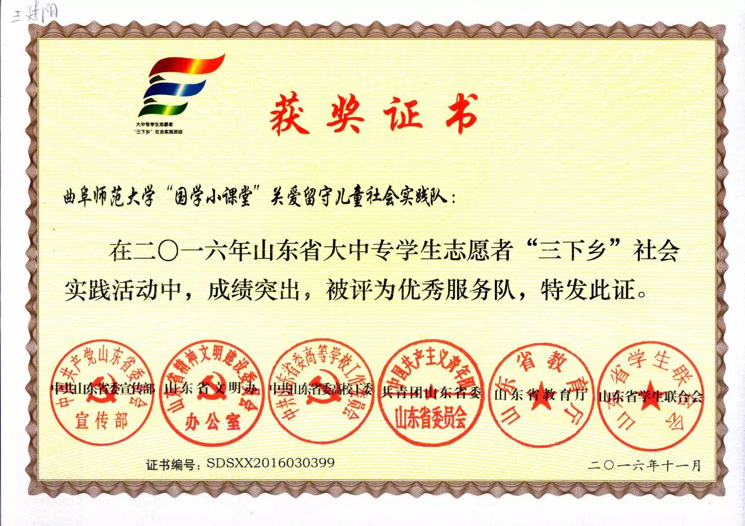 近日,2016年山东省大中专学生志愿者暑期三下乡社会实践活动落下帷幕。快猫视频 “国学小课堂”和“儒家文化齐鲁行”社会实践队双获优秀服务队和省级优秀实践团队,张俊成获优秀指导教师,刘雁成、朱晓明两位同学获优秀队员。