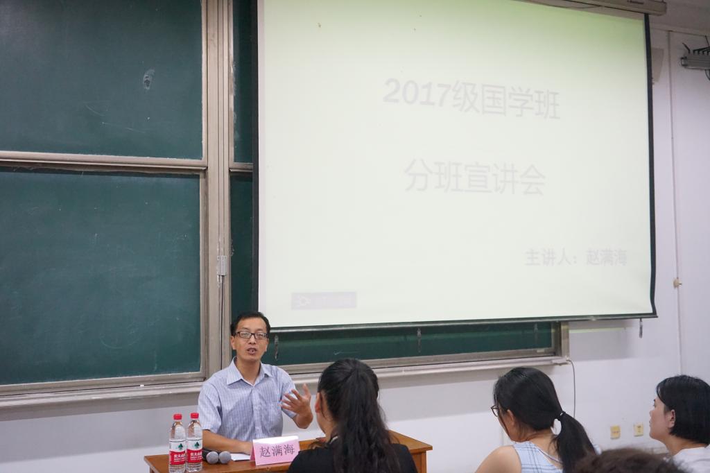 9月19日晚,快猫视频 国学教研室主任赵满海在综合楼203教室面向2017级历史班同学进行了2017级国学卓越班分班宣讲。
