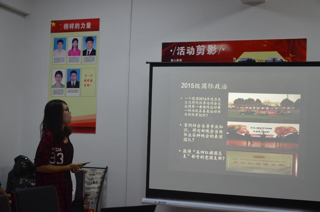 9月22日下午,快猫视频 班级文化建设活动评比答辩会在文史楼二楼会议室举行。快猫视频 团委书记王建阳、2014级辅导员韩琳琳及2016届学生会主席团成员高子期、阎文莉、井艺蓉、申潜担任评委。2015级与2016级各班代表参加答辩会。