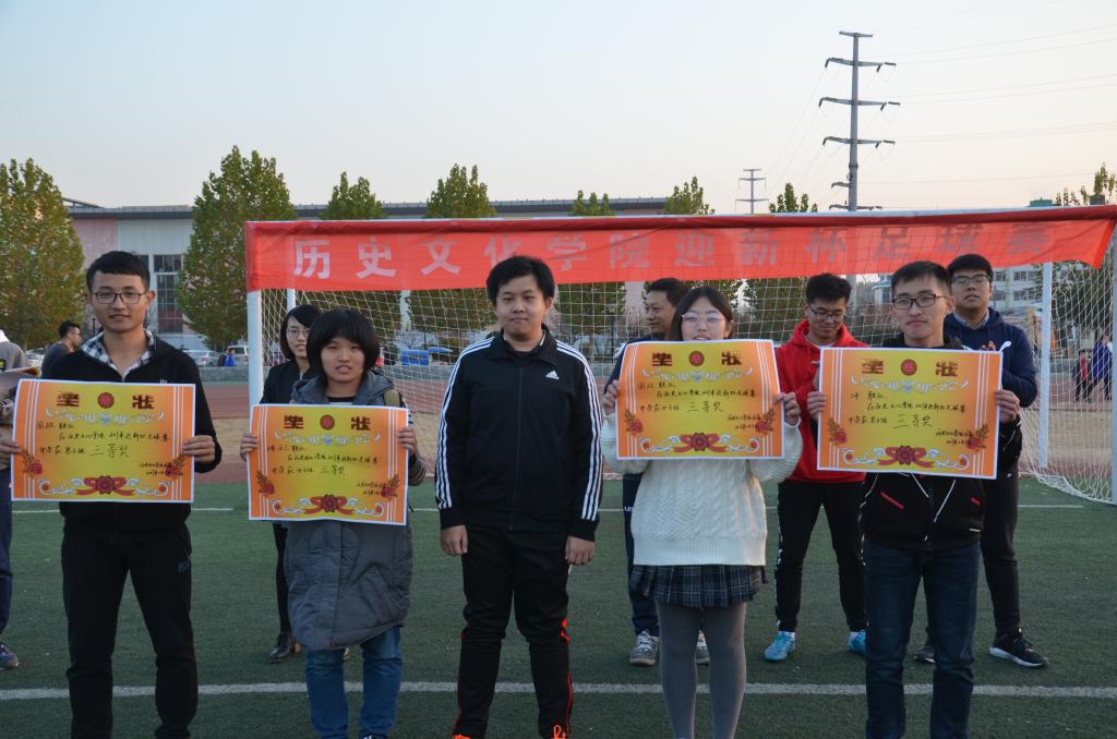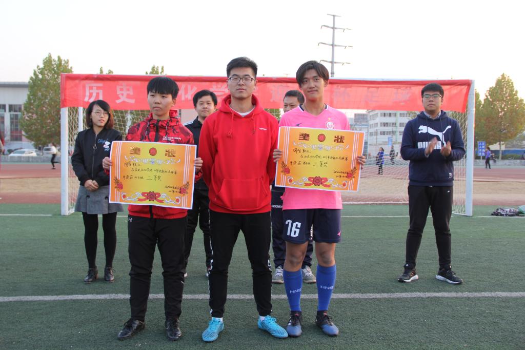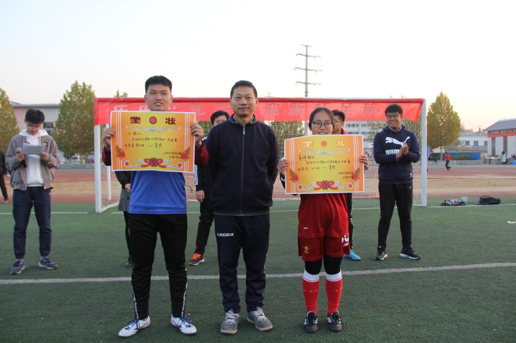 11月15日,经过两周多激烈的角逐,快猫视频 2017年“迎新杯”足球赛在西操场落下帷幕。快猫视频 刘伟老师,前足球队队长肖常志,前学生会副主席、前足球队副队长朱晓明,学生会副主席许鹏、郭伟伟出席闭幕式并为获奖队伍颁奖。