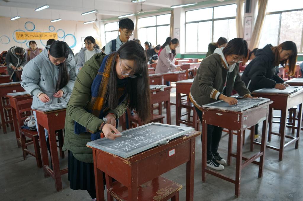经过初赛与复赛的激烈角逐,共有16名选手晋级决赛。比赛分为黑板书写和选手讲解两个部分,选手们通过播放ppt、配乐等形式展现了自己的书法特色,并对自己的作品进行了详细解读。在评委综合选手两个环节的表现进行打分后,张俊成老师对选手们的参赛作品进行了点评。他提出书法的重要性,并对如何写好汉字提出意见和建议。