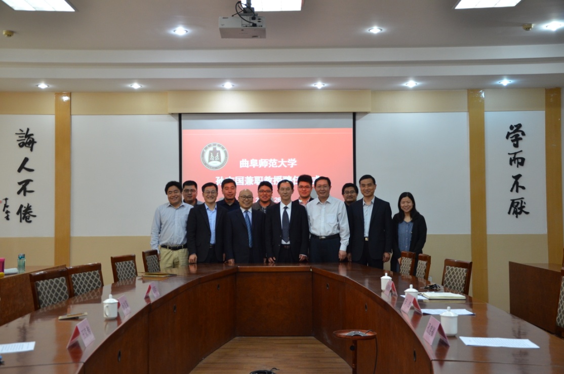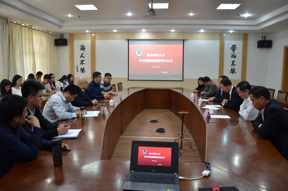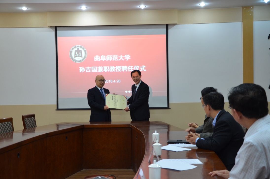 4月26日下午,快猫视频 在科技楼二楼北会议室举行聘任仪式,聘任山东省区域文化产业研究院院长、山东省高端智库人才入库专家孙吉国研究员为兼职教授。我校副校长辛杰、国内合作处处长孔宪福、人事处副处长孟祥水、快猫视频 院长成积春等出席仪式,辛杰代表学校向孙吉国颁发兼职教授聘书。